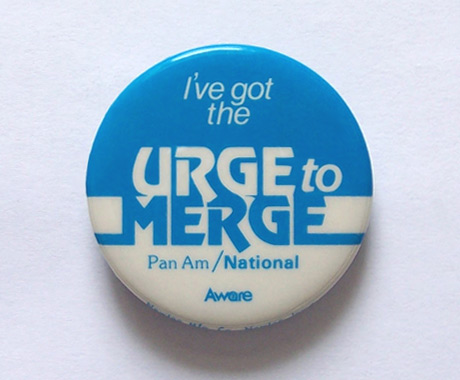 Detail View I've got the Urge to Merge Button from 1979 with the label "I've got the Urge to Merge". This pin was worn by employees to promote government approval of the merger between Pan Am and National Airlines. Diameter: 1,7 inch.